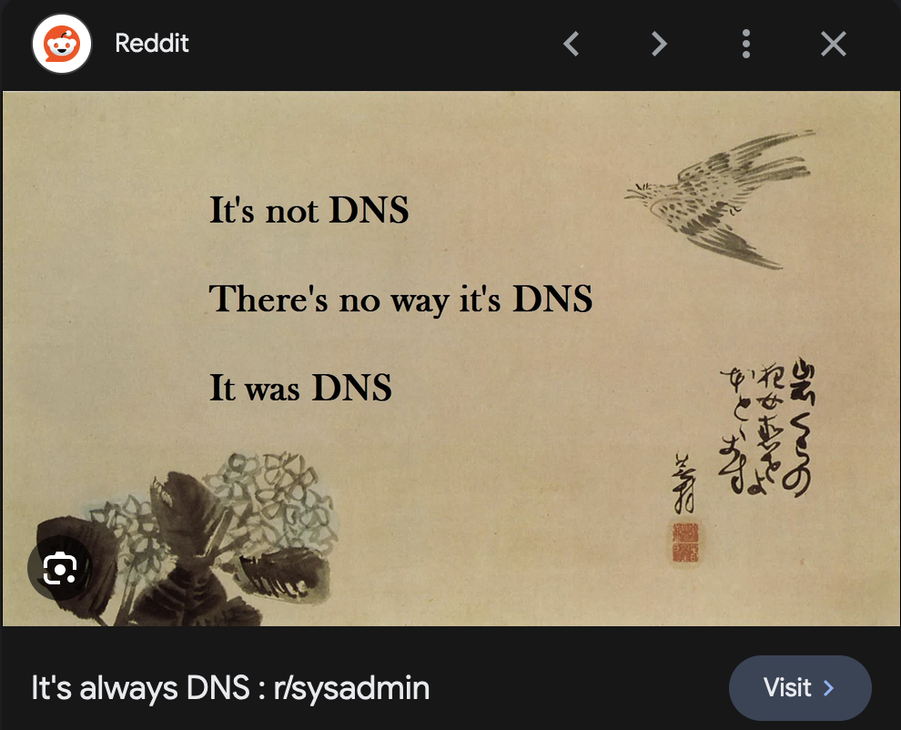 After having some first-hand experience with services going out of hand at work and seeing it happen elsewhere, I truly get why reliability and availability are pretty important guarantees for systems on the internet. DNS is an interesting example of a system that is extremely well designed and can yet be the root cause of many outages.