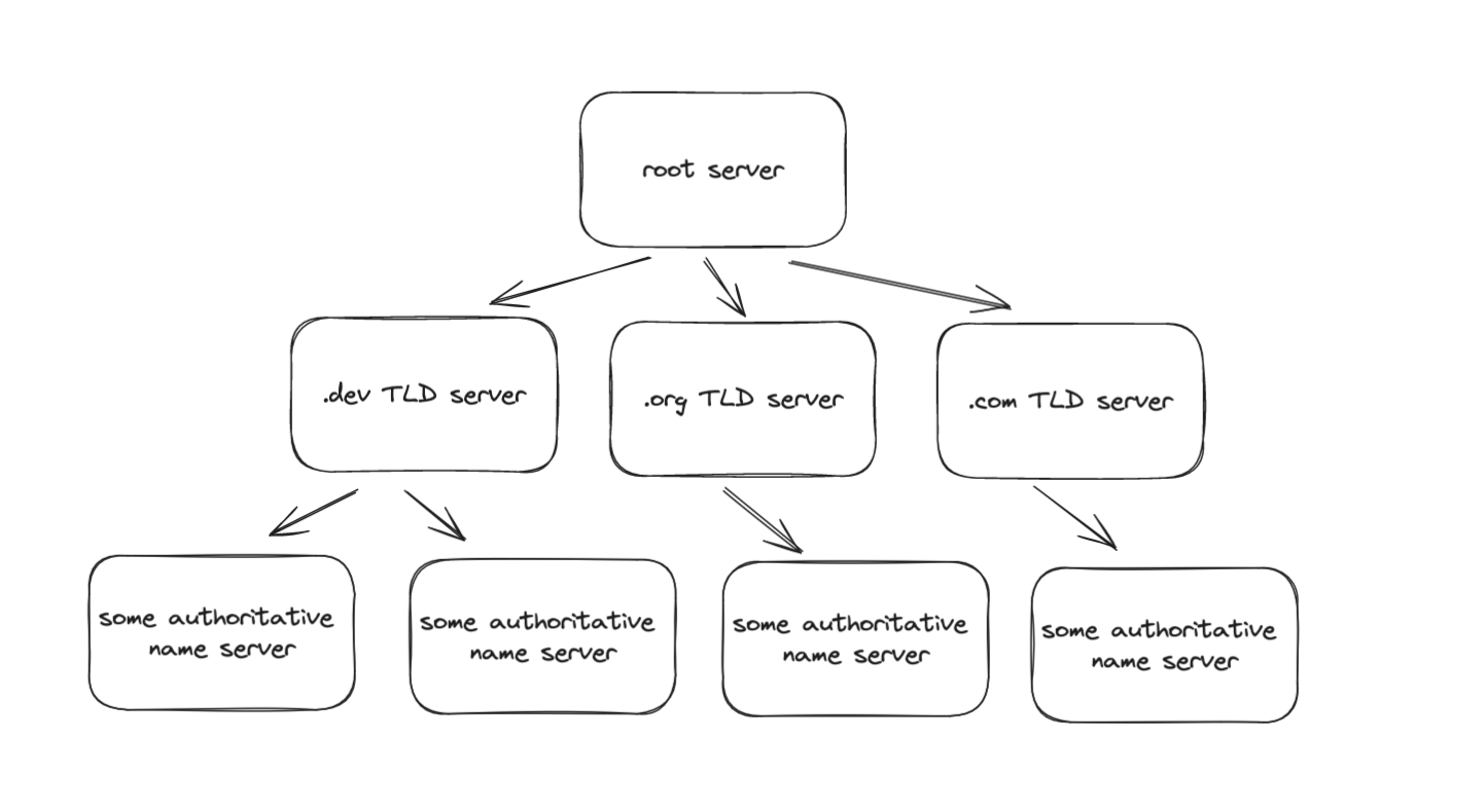 The root servers sit at the top most layer. For a given query, they will either return the IP if they have it or most likely, they will tell the address of another server that you can hit. This second server in the hierarchy is the TLD (top level domain) server. TLD is the last segment of a domain name, located after the last dot, such as .com, .org, .net, .gov, .edu, etc.
